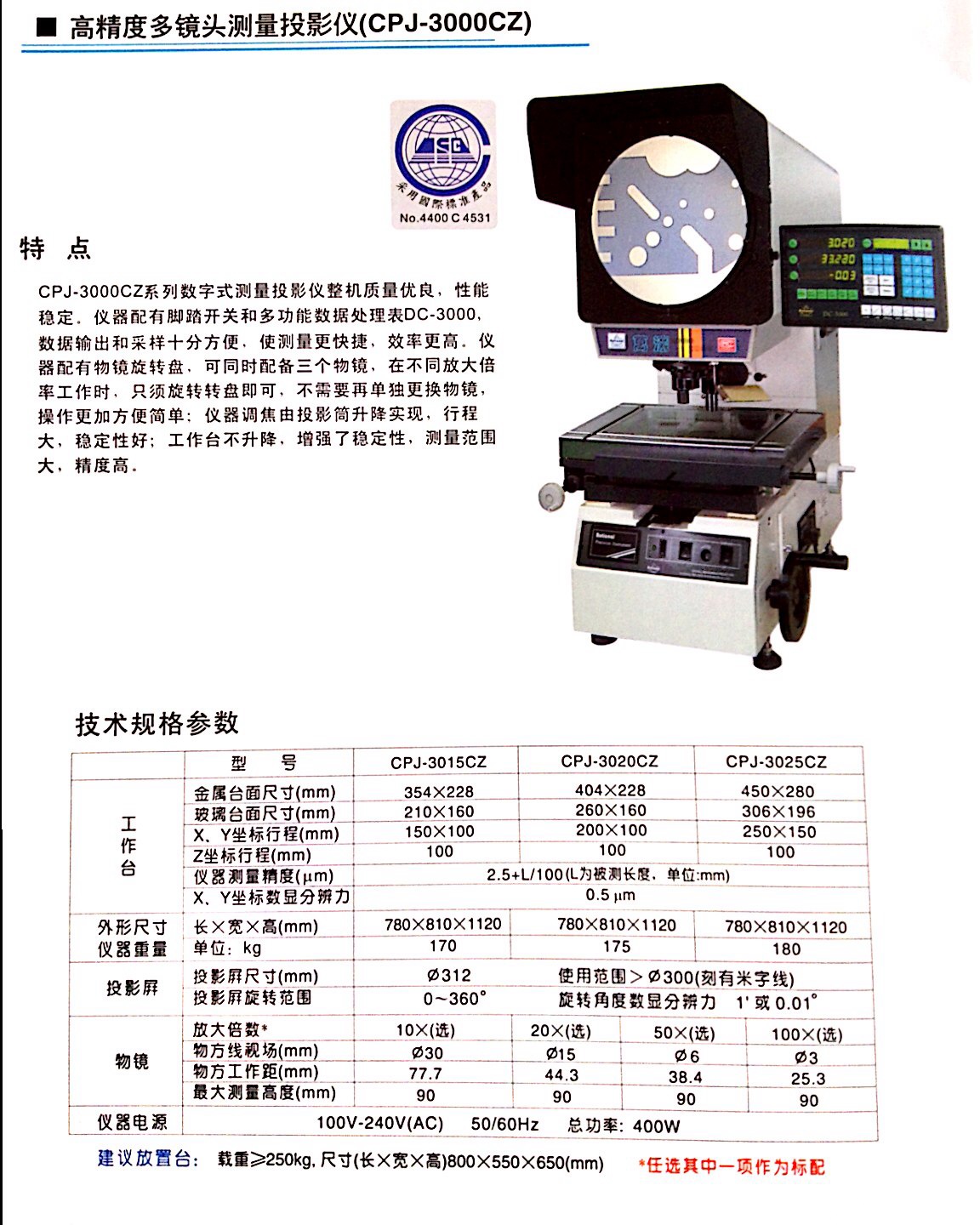 | CPJ-3025CZ投影儀整機品質(zhì)優(yōu)良,性能穩(wěn)定。儀器配有腳踏開關(guān)和多功能數(shù)據(jù)處理表DC-3000,數(shù)據(jù)輸出和采樣十分方便,使測量更快捷,效率更高。儀器配有物鏡旋轉(zhuǎn)盤,可同時配備三個物鏡,在不同放大倍率工作時,只需旋轉(zhuǎn)轉(zhuǎn)盤即可,不需要在單獨更換物鏡,操作更加方便簡單,儀器調(diào)焦由投筒升降實現(xiàn),行程大,穩(wěn)定性好;工作臺不升降,增強了穩(wěn)定性,測量范圍大,度高。 | ||||||||||||||||||||||